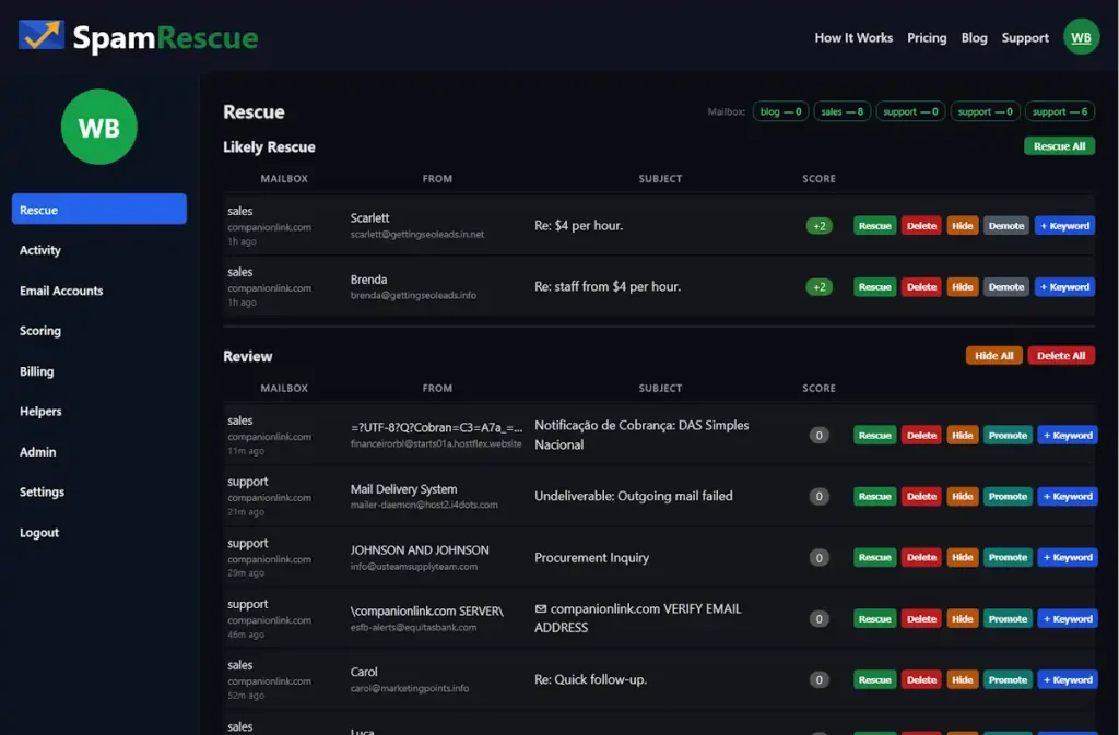 [Screenshot: SpamRescue Rescue dashboard showing multiple mailboxes and Likely Rescue queue]
