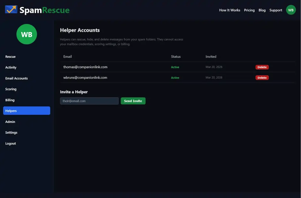 Ten mailboxes. Executives who will not check their own spam. A support queue that nobody is watching. SpamRescue’s Professional plan includes Helper Accounts — assign one staff member to monitor spam across all accounts. They see subject lines and senders. They never see the inbox, sent folder, or any credentials. Accountability without exposure.